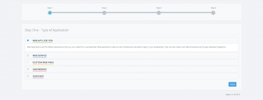 To add a web application click Create a New Application and then select Web Application. A new page will appear where you need to give the web application a name and provide the converted Excel spreadsheet.