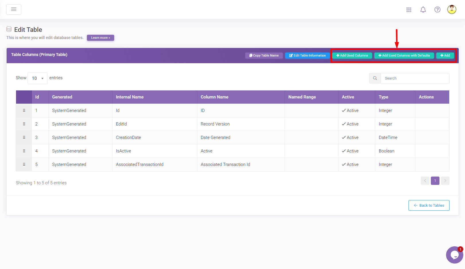 You can add new fields into this table using the Add button. If you’ve built the user interface before this step, you can click the Add Used Columns button to let the system go through each field you’ve used in the user interface designer.