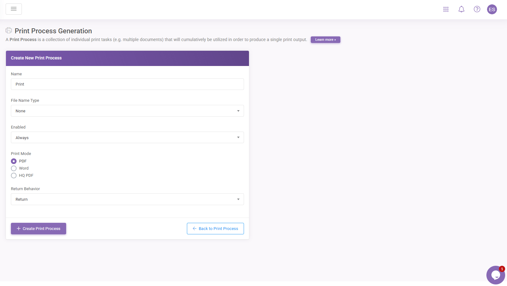 Active processes will be listed under the Print Processes section of this page. To define a new process, click the Add Print Process button. Then, give your print process a Name, select a File Name Type generation method, select from PDF or Word document types for the PrintMode, and finally click the Create Print Process to save this process.