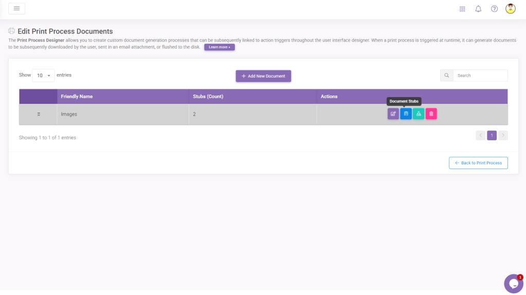 Once you have a new Print Process, you must import your templates into this module. When you hover your mouse over the Print Process you’ve created, you will see the Delete and Documents buttons. You can remove a print process by pressing Delete or upload your templates by going into the Documents.