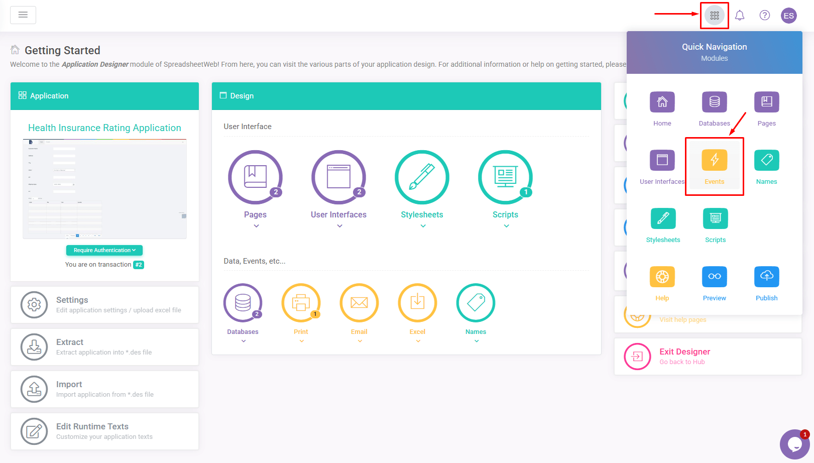 Once you have your document templates ready, you can create a print process and use it in your application interface. Go to the Events menu in the designer interface to create and manage print processes.