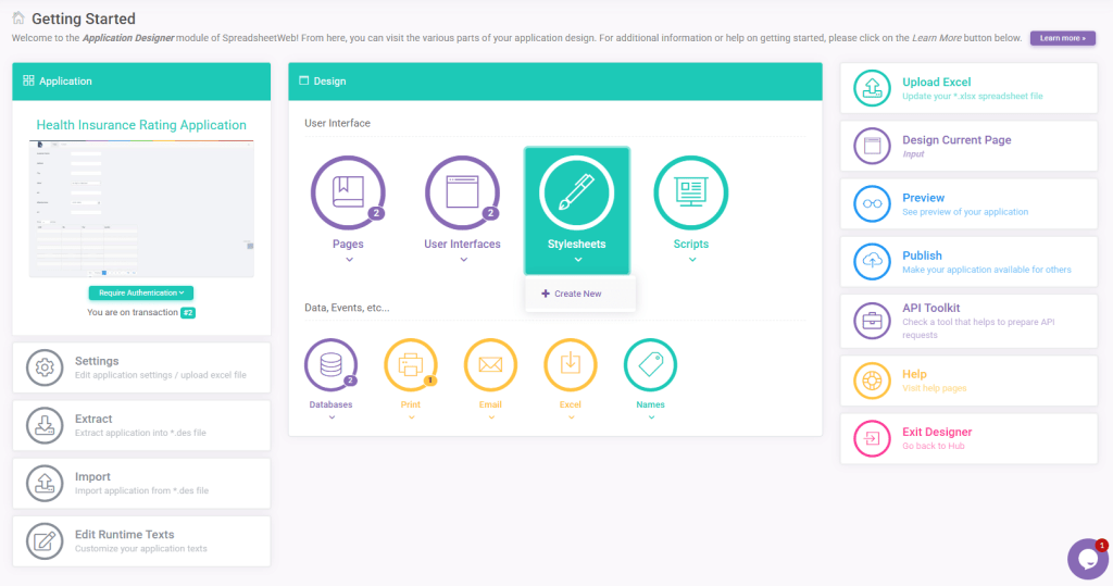 Designer Applications in SpreadsheetWEB can feature different visuals with the use of Stylesheets. Using CSS (Cascading Style Sheets) code, Stylesheets will give your applications a unique style, and can also help you customize the user interface in ways the User Interface designer can’t – such as adding custom spacing between elements, or coloring specific fields. To change the style of your application, go to the Stylesheets menu in the designer interface.