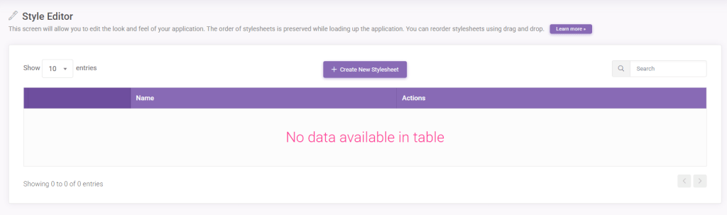 Active stylesheets will be listed on this page. Click Add Stylesheet to add a new stylesheet into your application.
