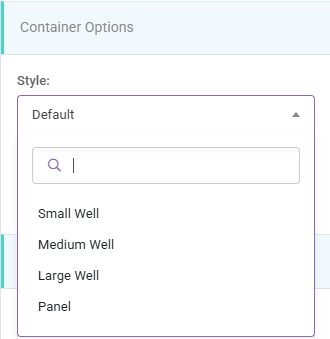 You can select a Well style from the Small, Medium, or Large options. The Panel option will make the container display like Card. After selecting Panel as style, Header and Footer inputs will appear where you can enter strings to be displayed on the header and footer sections of the container.