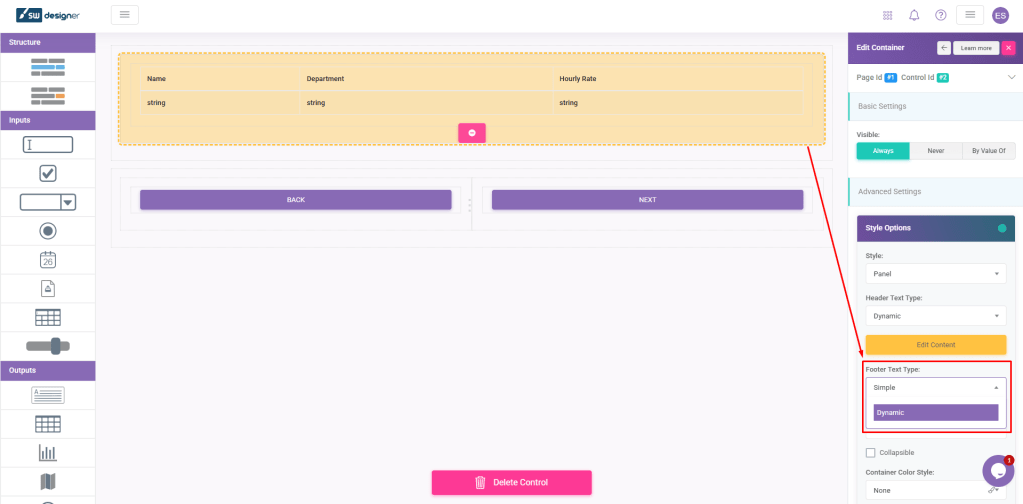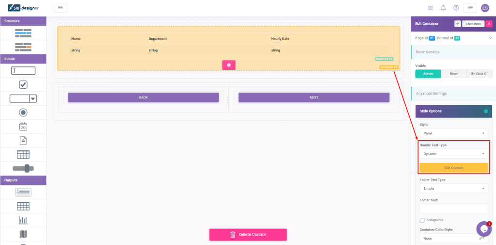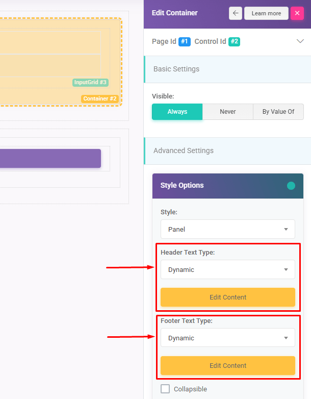 When the Collapsible property is enabled, the Panel containers can be toggle to show or collapse the Container area and all controls inside it. When you Preview or Publish the application, you can click the header name of a collapsible panel to hide or expand the entire panel.