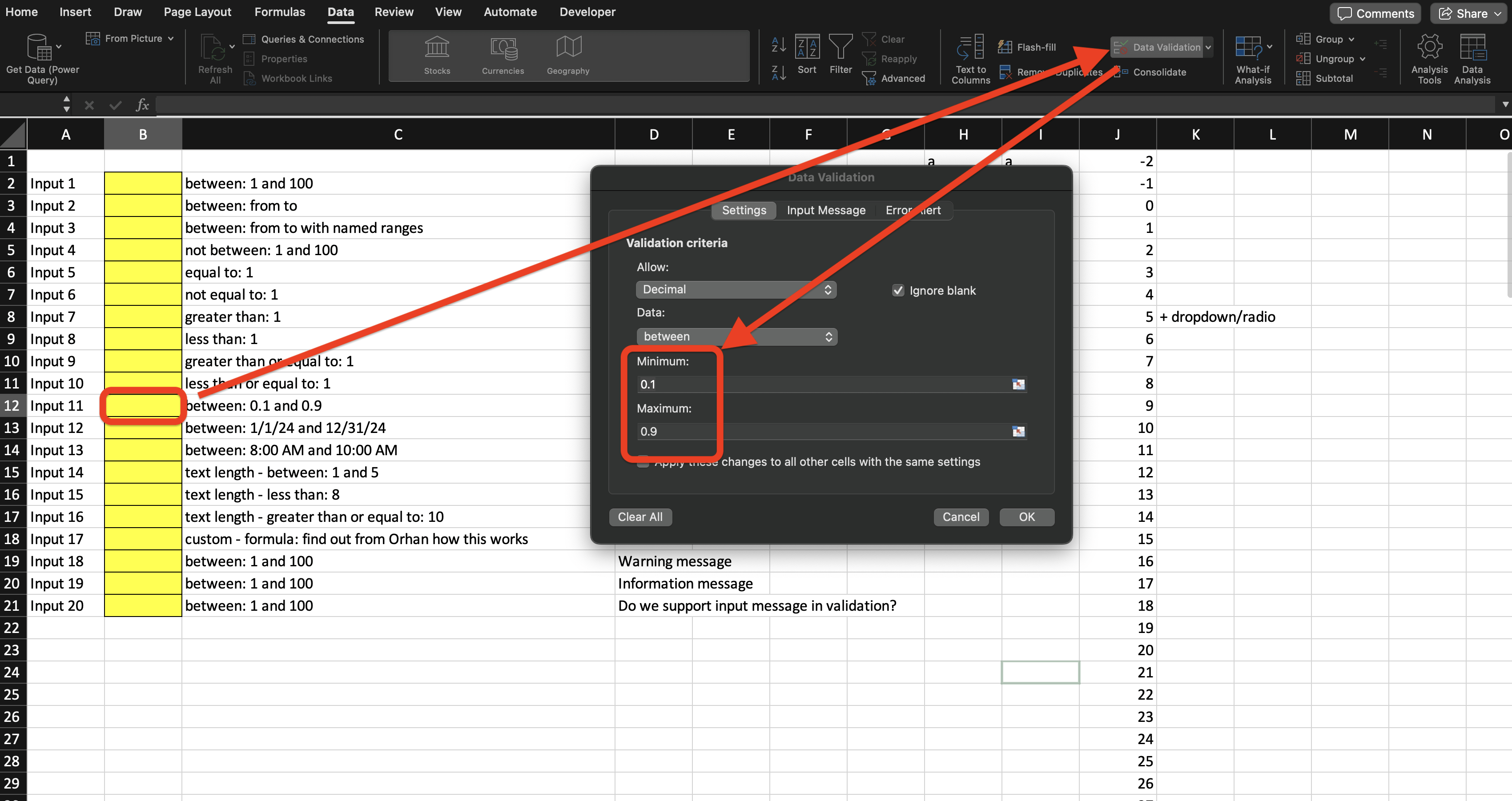 When Excel Data Validation is enabled, the Min/Max fields are managed directly through Excel for that cell or named range. The “Use Excel Data Validation” checkbox will only appear if the named range has Data Validation applied in Excel.