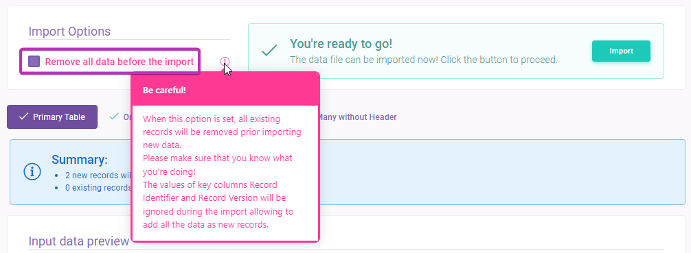 - The preview section displays data structure of the application database and the import data.