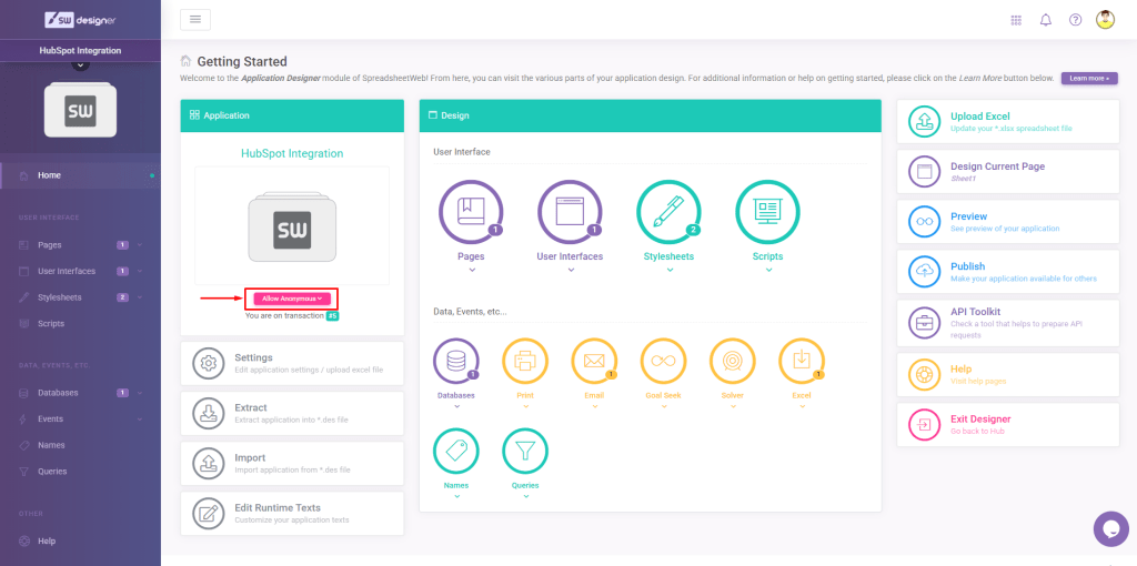Your SpreadsheetWeb application should be public to ensure that the integration works smoothly. To this end, open the SpreadsheetWeb Hub, click on the main menu, and select Designer. Now, proceed to the Application module, open your application, and select “Allow Anonymous” to make it public. This option allows HubSpot or any other external system to use and view the application you build.
