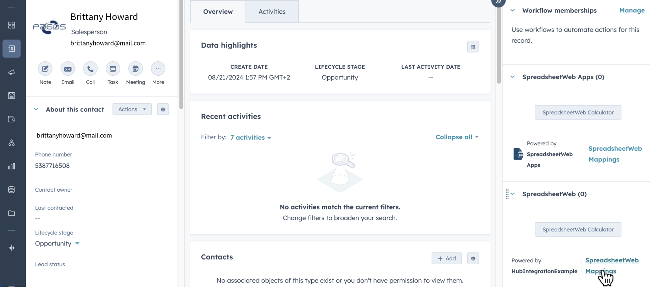 Note that you may need to create custom fields in your HubSpot account matching those in your SpreadsheetWeb application. After you have set up your columns and mapped your data, click Save. Then, refresh the page to view the changes. At this stage, your CRM object you have chosen has been successfully connected to SpreadsheetWeb.