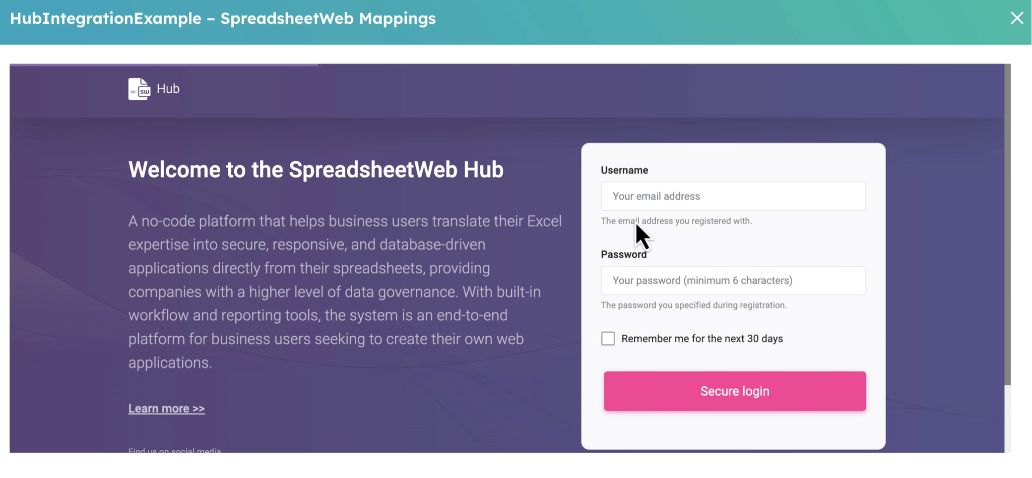 This opens a new window that connects to the SpreadsheetWeb Hub when clicked. The new window will require you to log into your account with SpreadsheetWeb. If you have more than one account or workspace, choose the one related to the CRM data.