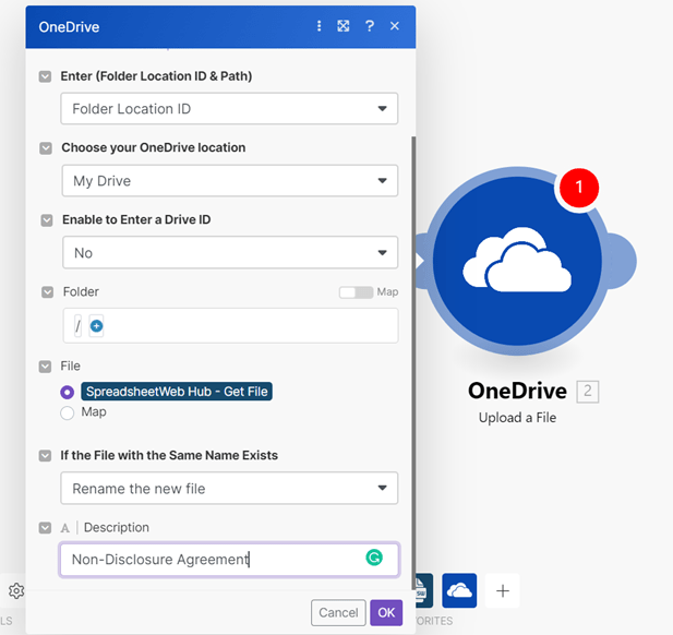 In this example, we will create a Scenario on Make.com to connect this application to OneDrive. Each time a new NDA document is created and saved on SpreadsheetWeb Hub, this scenario will upload the PDF file created to the recipient’s OneDrive.