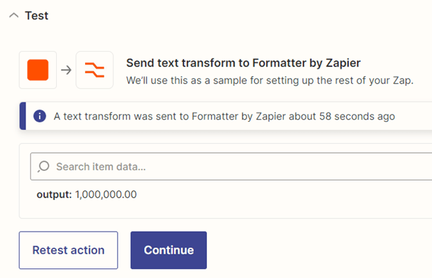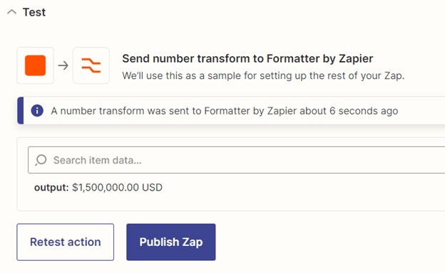 Test the Formatter app like any other in Zapier to see the output value. It should display the number without a currency symbol.