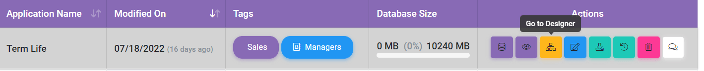 In SpreadsheetWeb Hub there is a new feature which lets you assign tags while saving a record. To use this feature, you need to have tags and add an action button to your application. If you have created tags, go to your Applications page, and click on Go to Designer for an application.