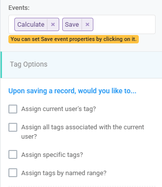 - Assign all tags associated with the current user: If you select this option, then the current user that is saving the record will have all of their associated tags applied to the record. For example, if the user is associated with an organization tag and a role tag, then those tags will be applied to the record.