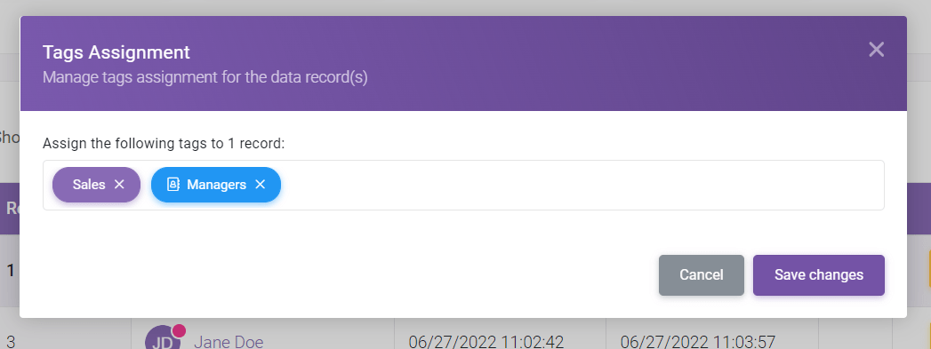 From the pop-up window, you can choose which tags to assign to the record. You can assign more than one tag to a record.