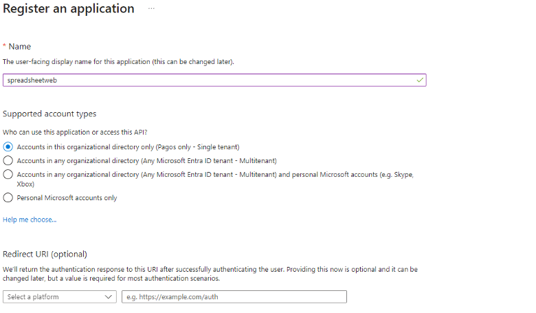 After making a new registration, the user will configure the “Name” section and select “Organizational Preferences’’ then will proceed to the “Register” button. “Redirect URI” will be left as empty. We will proceed to this section on the next steps (Authentication).