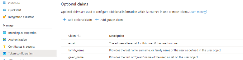 After this, the user will navigate to “Token Configuration” and add user claims, which will be received and processed by the web app as shown below.