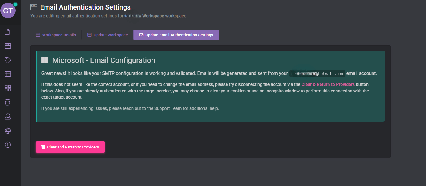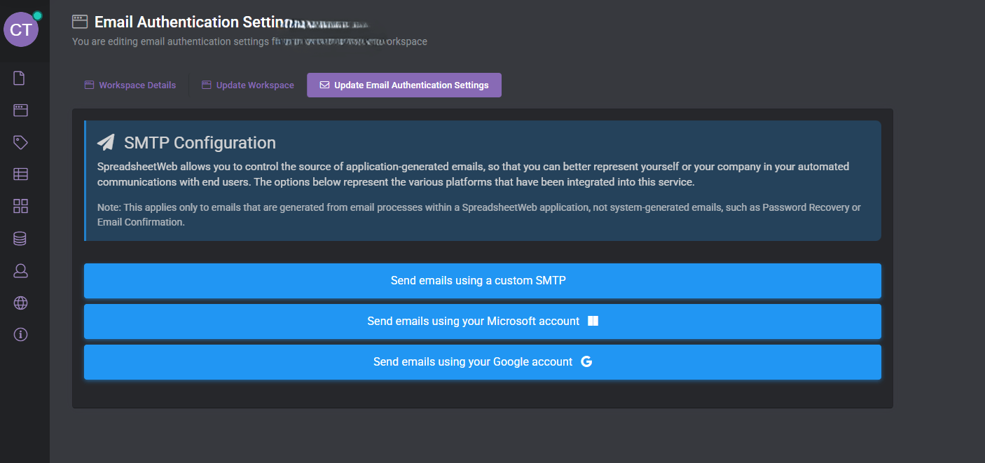 To configure your email, go to Workspace Settings and select Update Email Authentication Settings.