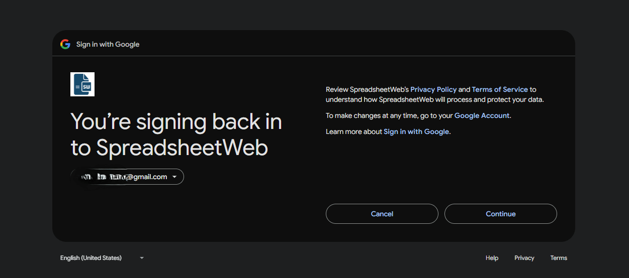 When prompted, grant SpreadsheetWeb the required permissions for sending and receiving emails on your behalf.