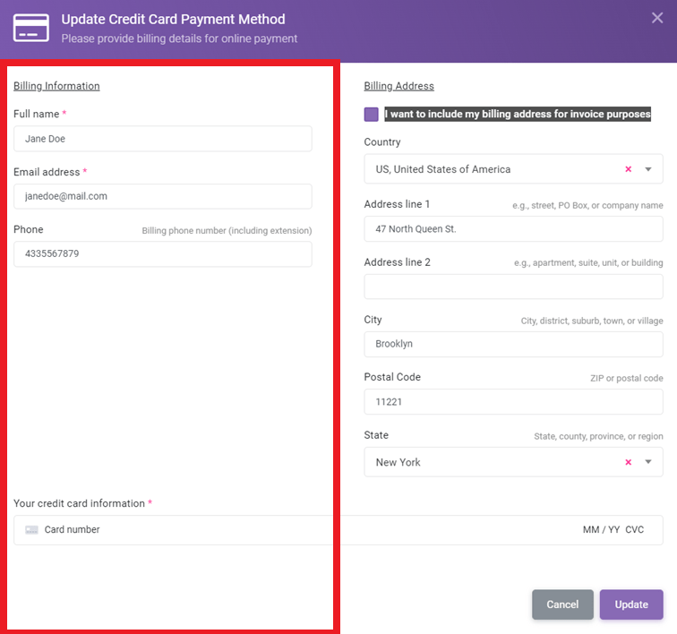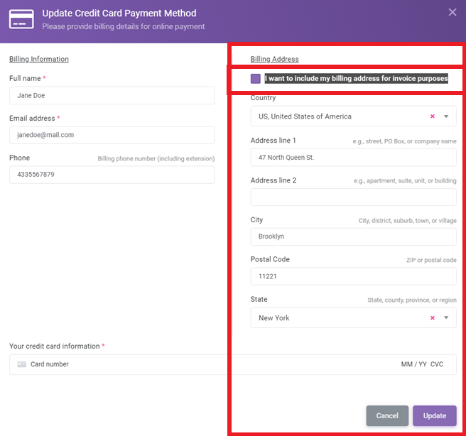 From the opened window, check ‘I want to include my billing address for invoice purposes’ and fill in the billing address information fields.