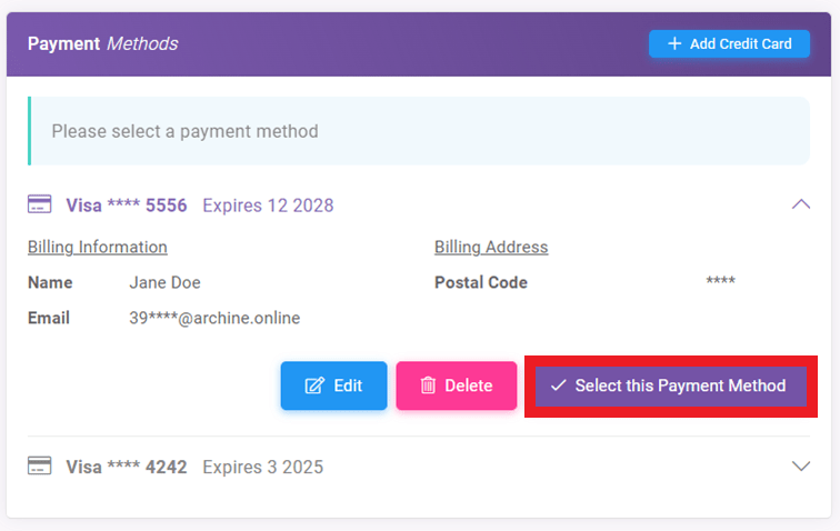 After the card is added, a pop-up window asking If you would like to select this card as the Payment Method will be displayed. Click on the ‘Select this card’ button to change your payment method immediately or ‘Not yet’ If you do not want to change it.