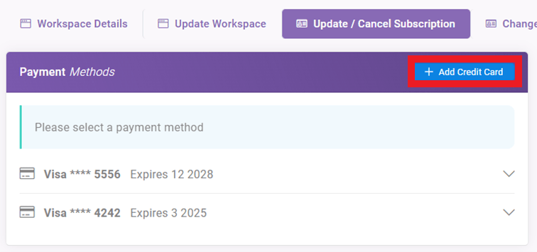 To change a payment method for a subscription, go to the My Workspaces page and click on ‘Edit’ for the workspace that you want to change the payment method.