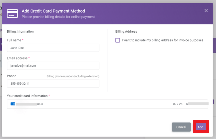After entering the card information, click on ‘Add’. The new card will be added to your Payment Methods list.