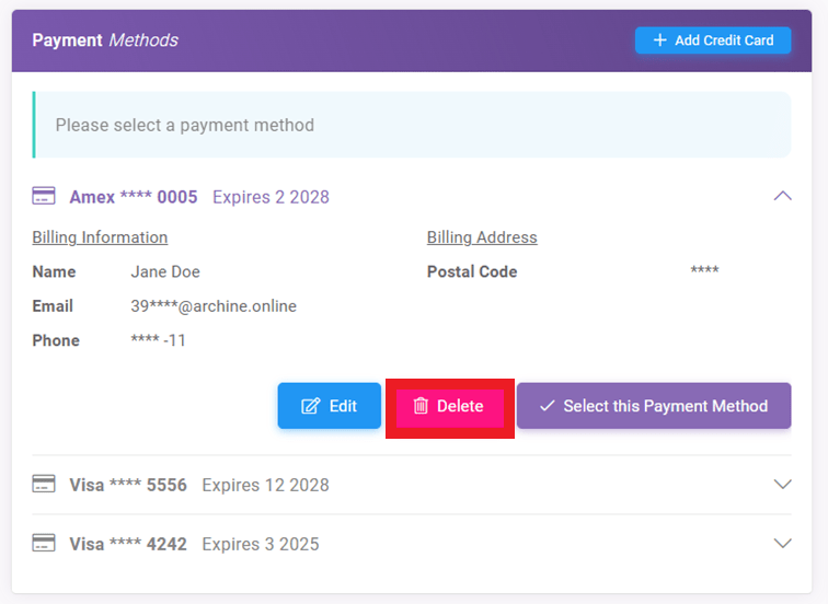 To delete one of your saved credit cards, click on the card that you want to remove from your payment methods from the ‘Payment Methods’ list and click on ‘Delete.’