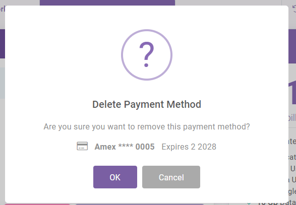 After clicking OK, the selected card will be removed from your saved Payment Methods.