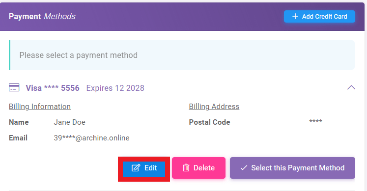 To add a new credit card, click on the ‘Add Credit Card’ button located on the top right side of the ‘Payment Methods’ window.