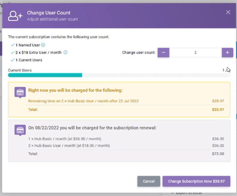 You can adjust extra user count and view billing information from the opened pop-up window.