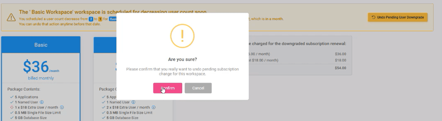 If you have decided to reduce extra user count in your workspace and scheduled a change but changed your mind, you can undo your pending user downgrade before its scheduled date. Go to Pending User Downgrade tab.