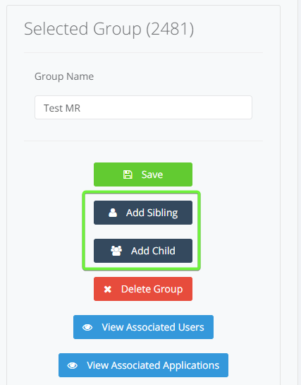 To create a new group, select one of the existing groups from the left. A sibling group will be on the same hierarchical level as the selected one, whereas a child group will be one level below.