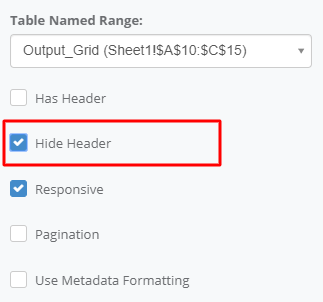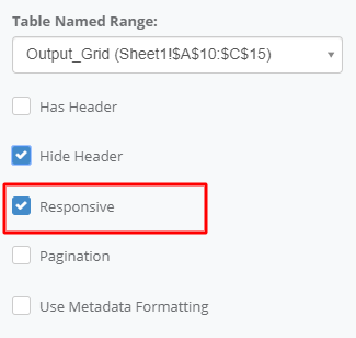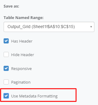 This feature may not be available for very large tables – this is dependent upon the size of the Table Named Range (TNR) and your server configuration. If the table’s cell count exceeds configuration setting (called MaximumCellCount, defaulted to 1000), then the server does not generate a full set of the required metadata for these ranges. Thus, the Use Metadata Formatting feature cannot be utilized in these cases.